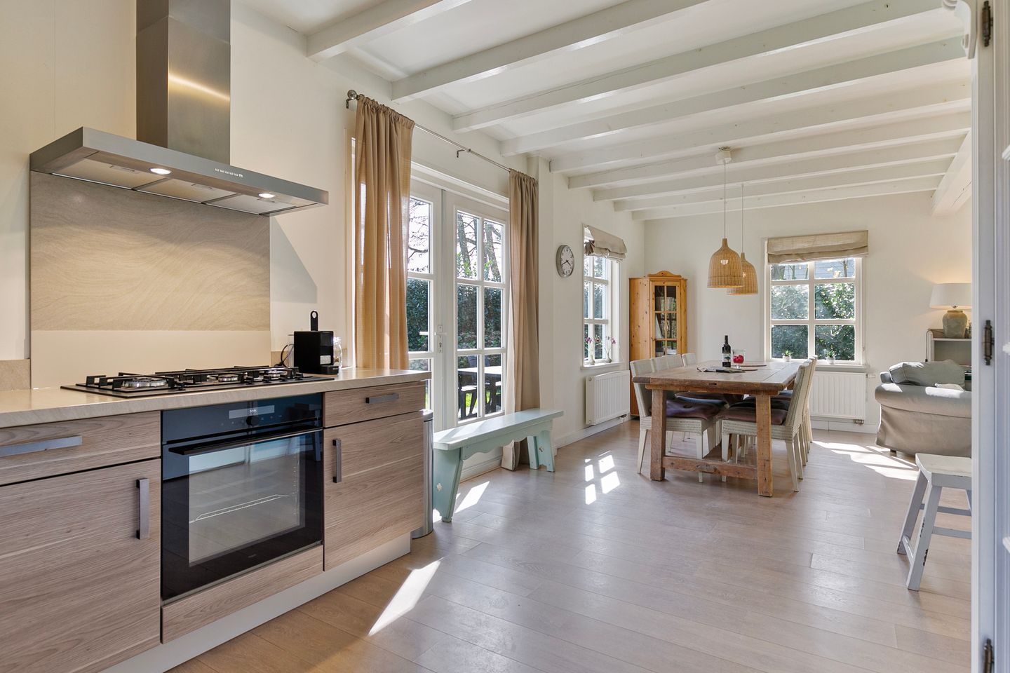 Eingang mit Zugang zu einem Schlafzimmer, einem separaten WC und dem L-förmigen Wohnzimmer mit offener Küche. Rundherum sorgen große Fensterflächen und mehrere Terrassentüren für viel Tageslicht und einen wunderschönen Blick in den umliegenden Garten – ein besonders heller und gemütlicher Wohnbereich.